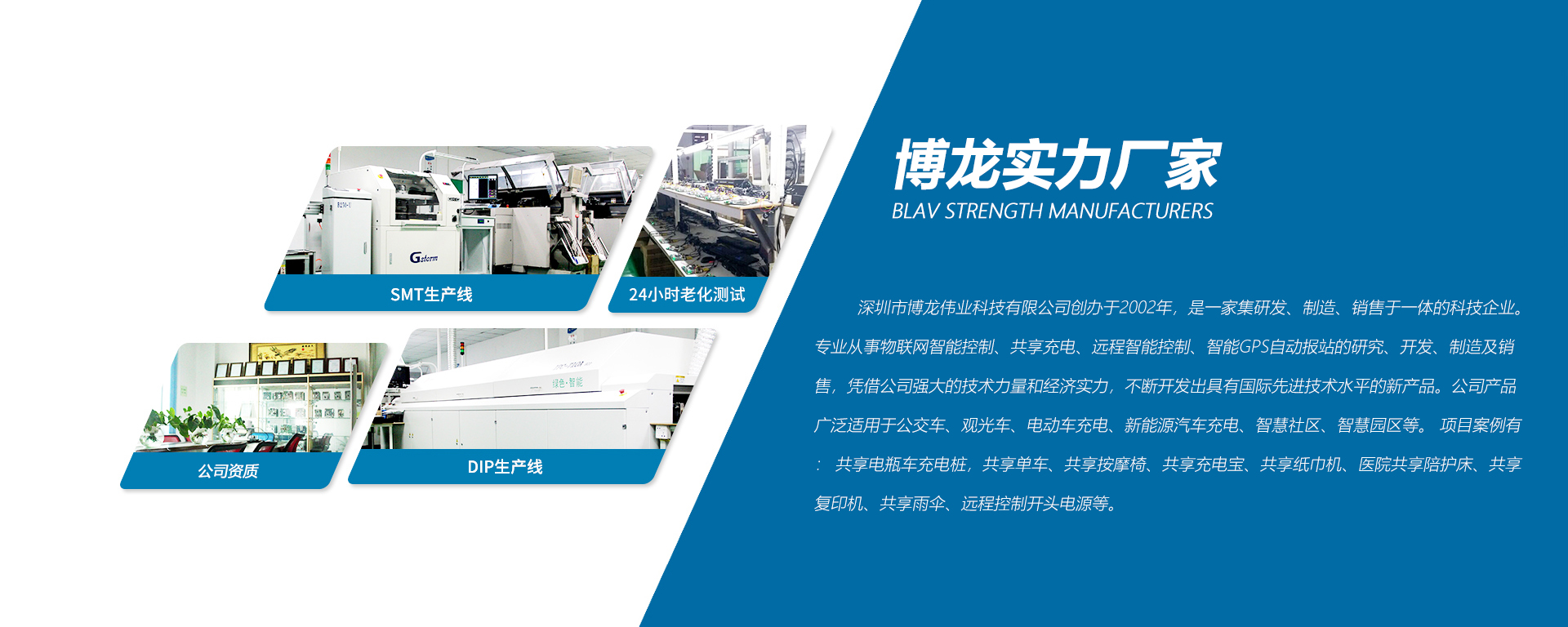 深圳市博龍偉業(yè)科技有限公司創(chuàng)辦于2002年,是一家集研發(fā)、制造、銷售于一體的科技企業(yè)。專業(yè)從事物聯(lián)網(wǎng)智能控制、共享充電、遠(yuǎn)程智能控制、智能GPS自動(dòng)報(bào)站的研究、開發(fā)、制造及銷售,憑借公司強(qiáng)大的技術(shù)力量和經(jīng)濟(jì)實(shí)力,不斷開發(fā)出具有國際先進(jìn)技術(shù)水平的新產(chǎn)品。公司產(chǎn)品廣泛適用于公交車、觀光車、電動(dòng)車充電、新能源汽車充電、智慧社區(qū)、智慧園區(qū)等。 項(xiàng)目案例有: 共享電瓶車充電樁,共享單車、共享按摩椅、共享充電寶、共享紙巾機(jī)、醫(yī)院共享陪護(hù)床、共享復(fù)印 機(jī)、共享雨傘、遠(yuǎn)程控制開頭電源等。